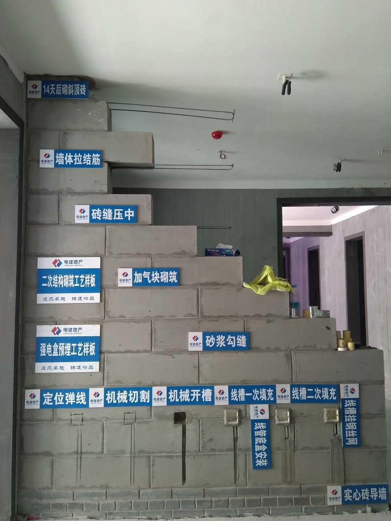 工法樣板間制作是安排工人到客戶現場在實體建筑里面根據施工節點做工法展示,包括砌體、構造柱、內墻抹灰、衛生間墻地面、廚房墻地面、水電安裝、門洞護角等。